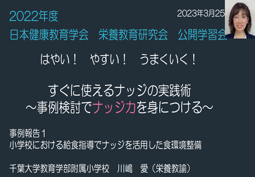 次に,川嶋愛先生(千葉大学教育学部附属小学校)に,給食指導でナッジを活用した食環境整備についての事例を報告していただきました。児童が適切に給食の配膳を行えるようにする工夫や,カトラリーを調整して盛り付けが行いやすくする工夫などについて,ご紹介いただきました。