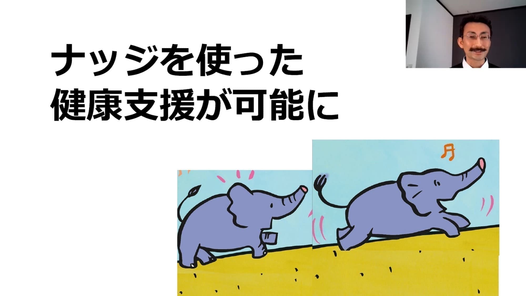 公開学習会は、ナッジに基づいて設計された講義とグループワークで構成され、「ナッジの基礎知識と健康教育での活用方法」などについて、実践事例やクイズを交えた参加型で行いました。竹林先生は、人間の感情を“象”で表現され、その感情が行動を実行させるために働きかける方法について、初心者でも楽しく、大変わかりやすいご講演をいただきました。ナッジを活用した事例を聞きながら、皆さん笑顔でうなずかれていました(「難しい顔で聞くより笑顔でうなずいた方が肯定的に理解できる」というナッジもあります)。
